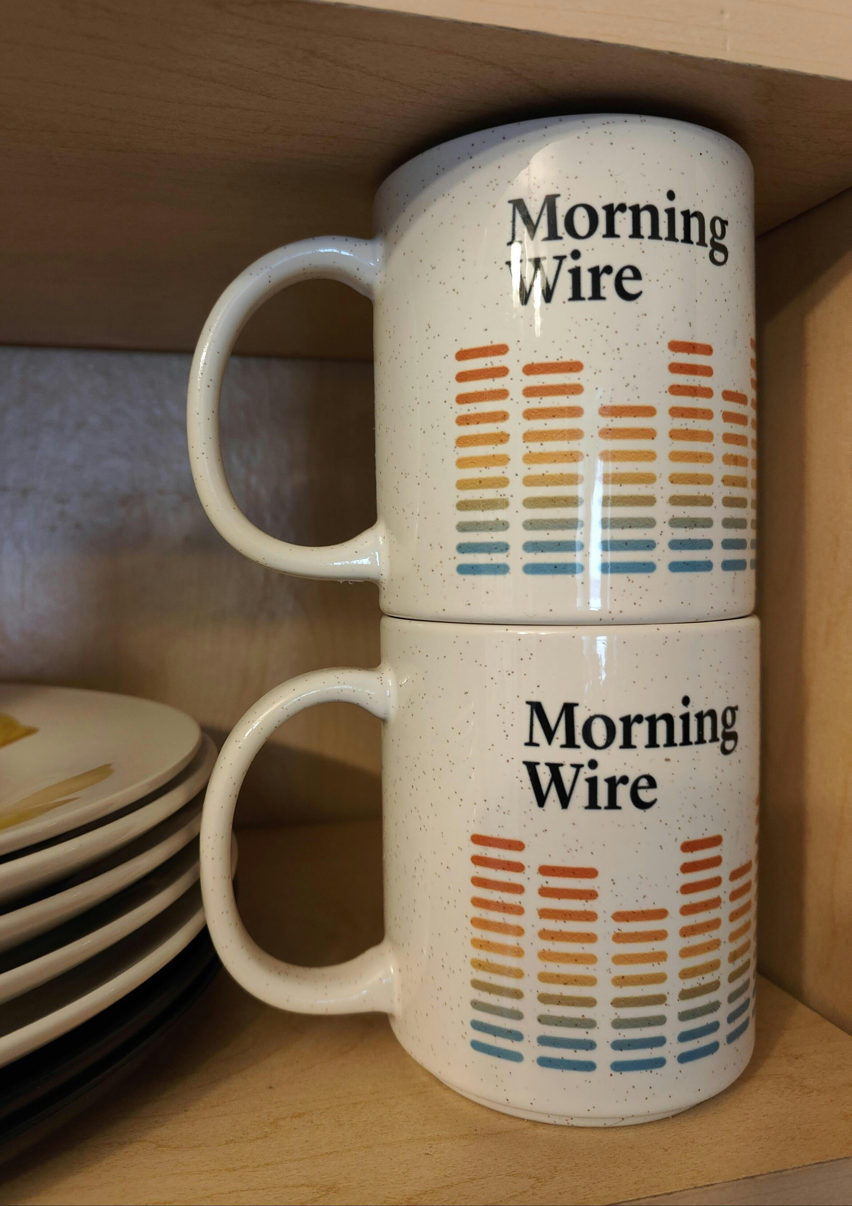 This type of mug stacks perfectly in your cabinet with offset footing that won't scratch the bottom mug and is the preferred Logo style of the household for Morning Wire.