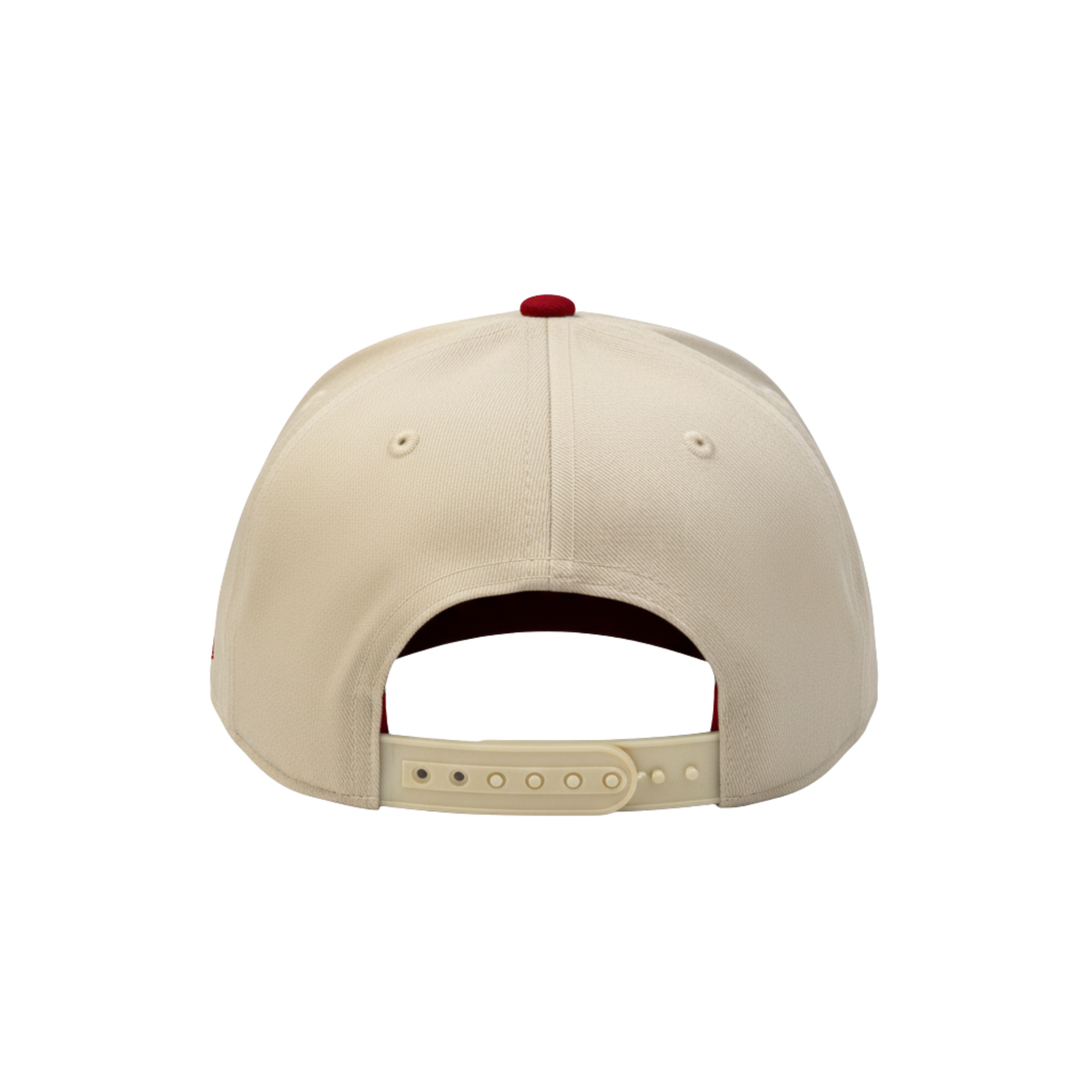 Back of a beige baseball cap with a red button on a white background